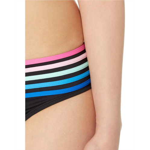 Plunging V-neckline accentuated by colorful stripes through the bustline.