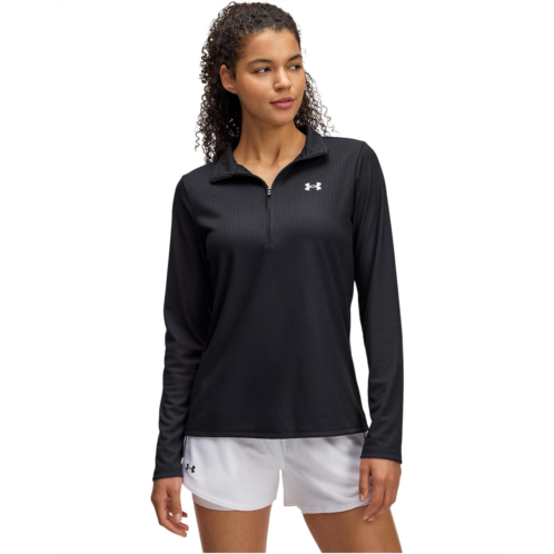 Exude a sporty and casual vibe wearing the Under Armour Tech Ribbed 1/2 Zip Top. The pull-on style top features a standing collar, a half-zipper closure, long sleeves, Under Amour logo detail at the left chest & back, and a straight hem.