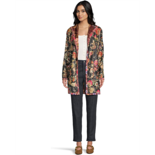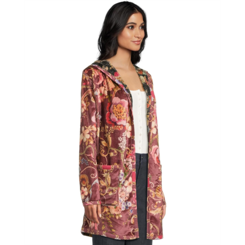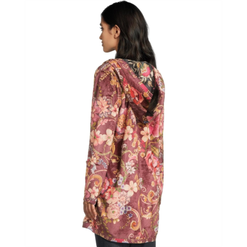 Cozy meets captivating in the Johnny Was Joan Midi Sherpa Jacket (Reversible) - Rolanda Coat, blooming with vibrant floral print in shades of pink, gold, and plum against a rich burgundy backdrop. Designed with an easy, relaxed fit and a soft hood, an open-front design, and long sleeves, it blends comfort with statement-making style - perfect for layering on chilly days while keeping your look effortlessly bold.
