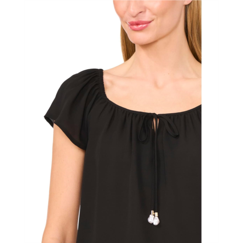 The CeCe Center Front Tie Round Neckline Flutter Sleeve Top combines a soft, feminine charm with effortless sophistication. Its lightweight, flowing short sleeves and tie-neck detail add breezy elegance to your silhouette.