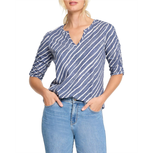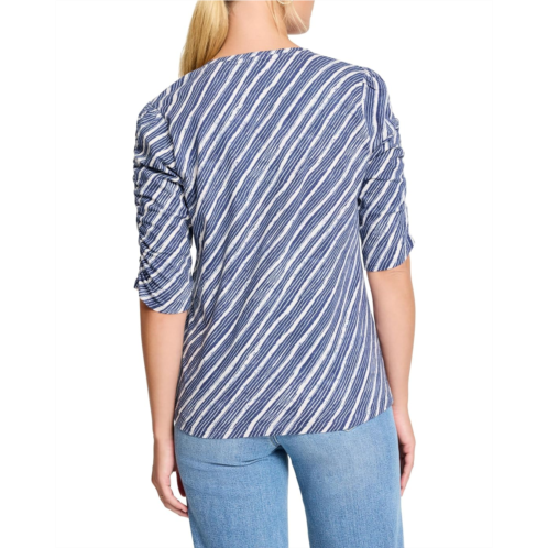 Add style to your look wearing NIC+ZOE Mixed Stripe Ruched Sleeve Tee with the ease of your favorite throw-on tee but feminine details that add a little something extra. The pull-on style top features a split neckline, short ruched elbow sleeves, and allover printed details.