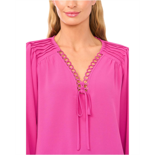 Exude sleek sophistication with a dash of style wearing the CeCe Long Sleeve Circular Trim Pintuck Top. This pull-on style blouse combines delicate pintuck detailing with a flattering V-neckline for a refined, feminine look. Long puff sleeves and circular trim accents on the neck with a tie-up design add subtle texture and interest, elevating it beyond the everyday basic.