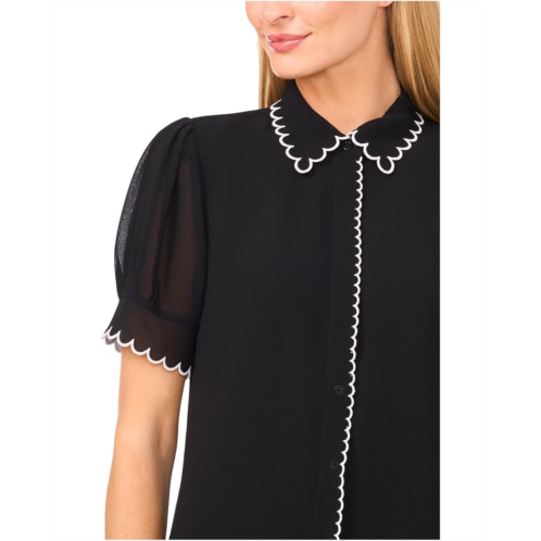 This Short Sleeve Button-up Blouse by CeCe is a fresh and feminine take on a classic. It features a clean placket and a contrast scallop trim along the collar and sleeves, adding a subtle yet stylish detail.
