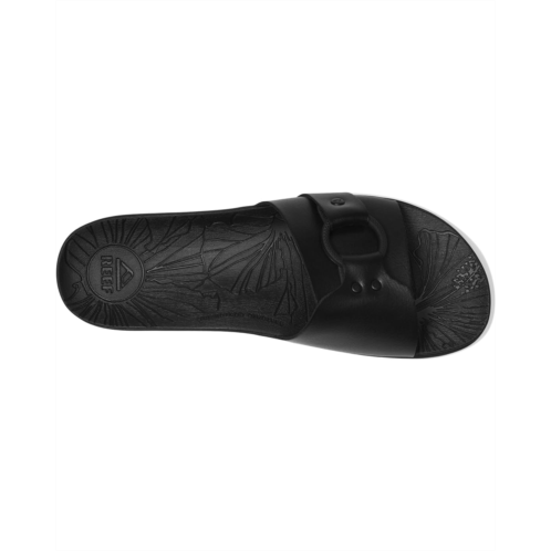 Chic, comfy, and ready to travel. An elevated take on a classic slide, the Reef Cushion Soho Cruz is perfect for dressing up or styling down on your next sunny outing. It's crafted with soft vegan leather, a rubber outsole, and generous arch support to keep you comfortable from vacation to city exploration. The Cushion Soho Cruz is ready for any adventure. Soft and supportive cushion with a rebound footbed with a hibiscus flower footbed design deboss. Super soft unlined PVC Free vegan leather slide with faux raffia molded buckle and recycled hardware detail.
