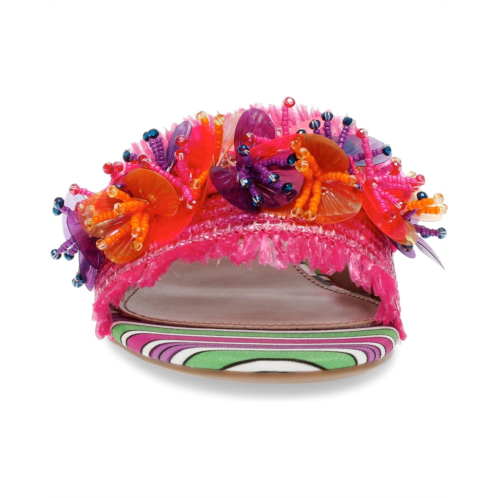 Transition every look of yours into an eye-catching retreat as you wear the colorful and vibrant Blue by Betsey Johnson Peyten Flat Sandals. The slip-on footwear features ornamented raffia upper top strap with synthetic rubber lining and cushioned synthetic insole.