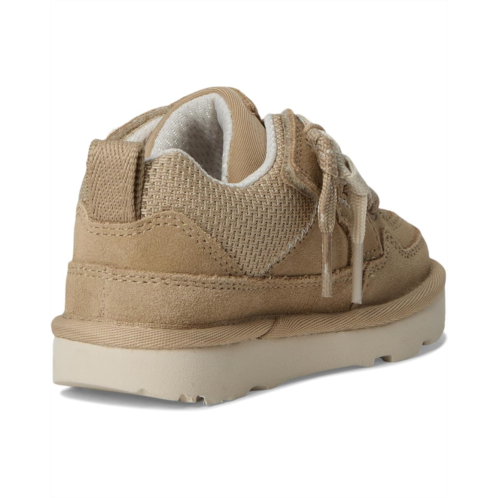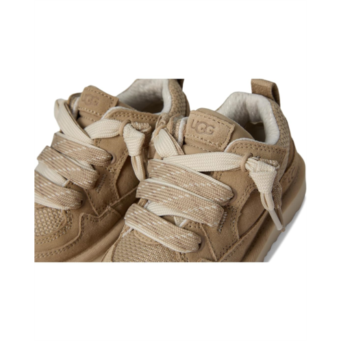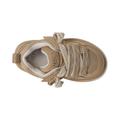 Enjoy plush cushioning and comfort like never before wearing UGG Kids Lo Lowmel Sneakers. The lace-up sneakers are crafted with a suede textile upper, textile lining with recycled polyester & polyester, textile sockliner with recycled polyester & polyester, and a foam footbed. The twotone flat laces are made from UNIFI recycled polyester fibers and the textile binding is made from recycled polyester fibers. These low-top shoes feature a webbing heel strap, UGG logo patch on the tongue, and a round-toe silhouette.