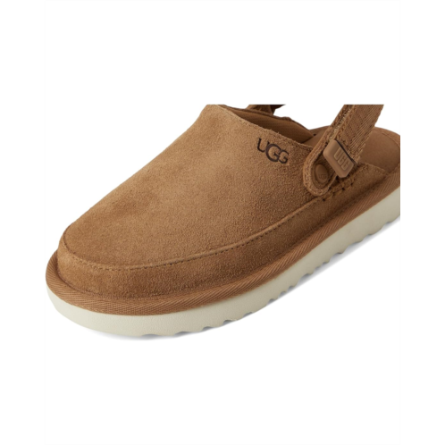 Clogs might be the shoe of the moment, but this one has the comfort your kids love from the UGG Kids Toddler Goldenstar Clogs with a suede upper and a foam footbed. These clogs come with an adjustable heel strap and hook-and-loop closure so the fit is just right for all-day play. The 100% recycled polyester lining keeps your kid's feet cool and comfortable. These clogs feature a TPU strap end with a graphic UGG font for added style. Make sure your kid experiences all-day comfort and support wearing these slide clogs.