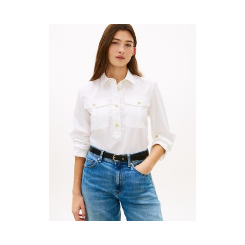 Tommy Hilfiger women's shirt. For office hours and beyond, this lightweight poplin shirt is cut in a relaxed drape for an airy feel. Featuring a chic spread collar, gold-tone buttons and flap pockets, it blends polished details with effortless, everyday versatility.