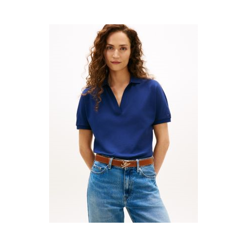 Tommy Hilfiger women's polo. Channel sporty vibes with this relaxed polo, designed in a versatile hue with an open placket. Made from premium cotton pique, the medium-weight stretch fabric offers a soft, lightweight feel that keeps you comfortable all day.