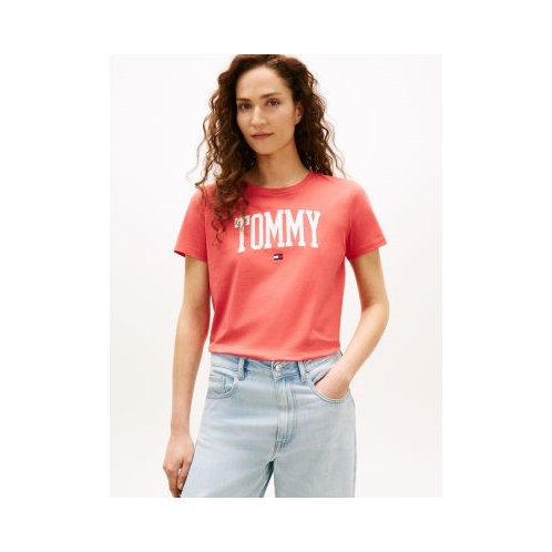 Tommy Hilfiger women's T-shirt. Made from a breathable cotton-jersey knit with a smooth, soft feel and excellent stretch, our tee is super comfortable. This iteration is finished with a collegiate-inspired Tommy logo.