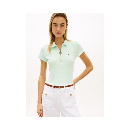 Tommy Hilfiger women's polo. Designed in a trim fit from premium cotton, this short-sleeve polo has an elevated feel, thanks to the gold-tone zip placket.