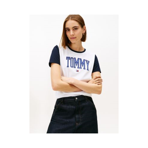 Tommy Hilfiger women's T-shirt. Our ringer tee has a cool, sporty vibe with its colorblocked sleeves and arched varsity Tommy logo. Made from pure cotton jersey, it's a soft, comfortable layer.