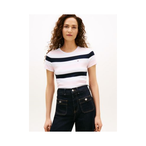 Tommy Hilfiger women's T-shirt. Bold rugby stripes lend a sporty feel of this comfy cotton tee.
