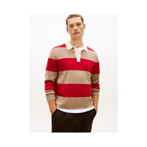 Tommy Hilfiger men's sweater. This sweater polo is made from Punto Milano a smooth, soft double-knit blend with a hint of stretch for flexibility and comfort. Rugby stripes and a relaxed fit balance casual ease with refined construction, making it perfect for layering or wearing on its own.