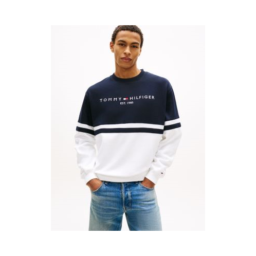 Tommy Hilfiger men's sweatshirt. Our seriously soft pullover sweatshirt is made from brushed-back fleece with a flat, clean face and smooth feel. This layer is designed in a colorblock finish with a sporty Tommy logo for laid-back vibes.