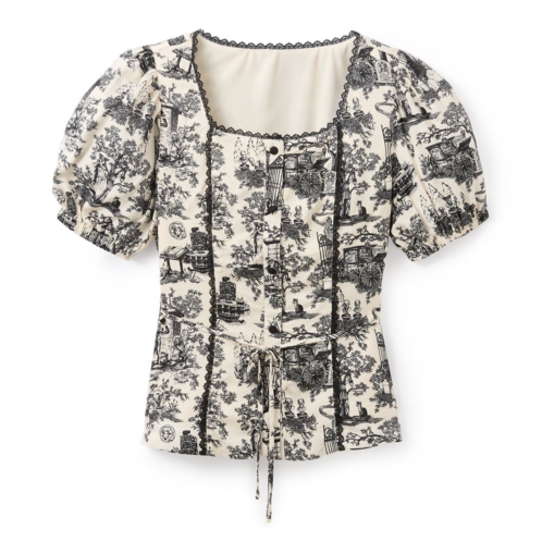 At least your style won't be in danger when wearing this fashion top by Her Universe trimmed with delicate black lace. It features an allover vintage-inspired design depicting many of the spectral inhabitants ofThe Haunted Mansionattraction. The puff short sleeves and tie waist make this ghostly garment to die for.