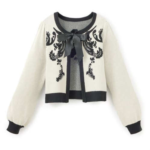 Foolish mortals are welcomed to warm their chills in the shrouded elegance of this Her Universe soft knit cardigan sweater inspired byThe Haunted Mansion. Fancy paisley filigree decorates both sides, and surrounds an embroidered ''HM'' monogram dead-center on the back. A large black satin bow ties at the neckline for a drop-dead gorgeous effect.