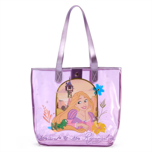 This swim bag is sure to be a clear favorite with Rapunzel fans. Inspired by Disney'sTangled,the carryall's translucent sides feature the Disney Princess and her chameleon companion, Pascal, on the front. Two iridescent flower appliques feature golden stud centers while the sparkling simulated leather handles mean they can carry themselves like a princess on their trips to the pool or sea.