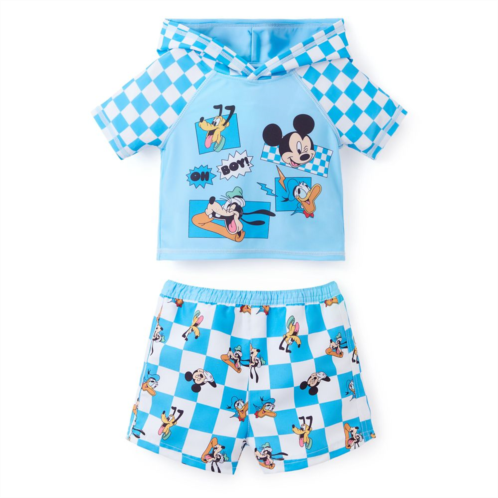 Let Mickey Mouse and Friends join your baby for some fun when wearing this adorable swim set. Featuring a checkerboard pattern with Mickey, Goofy, Donald Duck, and Pluto art, this two-piece set includes a hooded rash guard with 3D ears and matching elastic-waist swim trunks. Each piece has built-in UV protection so they can play worry-free under the sun.