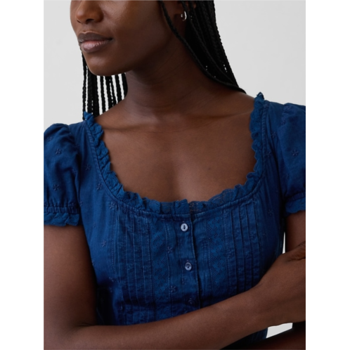 - Short puff sleeves with elasticized cuff and ruffle trim.