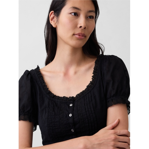 - Short puff sleeves with elasticized cuff and ruffle trim.