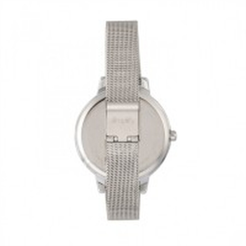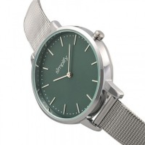Silver-tone alloy case with a silver-tone stainless steel bracelet. Fixed silver-tone bezel. Teal dial with silver-tone hands and index hour markers. Minute markers around the outer rim. Dial Type: Analog. Quartz movement. Scratch resistant mineral crystal. Pull / push crown. Solid case back. Round case shape, case size: 38 mm, case thickness: 9 mm. Band width: 14 mm. Box with tongue and safety clasp. Water resistant at 30 meters / 100 feet. Functions: hour, minute. Casual watch style. Watch label: Japan Movt. Simplify The 5800 Watch SIM5802.