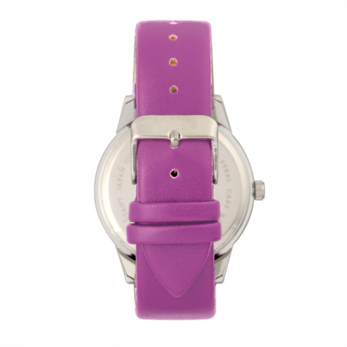 Silver-tone alloy case with a fuchsia leather strap. Fixed silver-tone alloy bezel. Multicolor dial with silver-tone hands and index hour markers. Minute markers around the outer rim. Dial Type: Analog. Luminescent hands. Quartz movement. Scratch resistant mineral crystal. Pull / push crown. Solid case back. Round case shape, case size: 41 mm, case thickness: 10 mm. Band width: 20 mm. Buckle clasp. Water resistant at 30 meters / 100 feet. Functions: hour, minute, second. Casual watch style. Watch label: Japan Movt. Crayo Electric Ladies Watch CRACR5001.