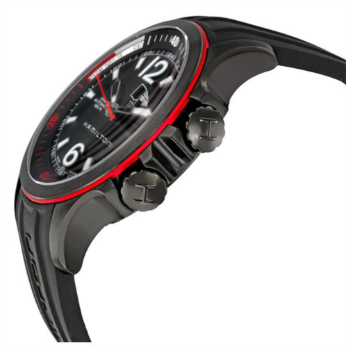 Black PVD steel case with a rubber bracelet. Fixed blacl PVD bezel. Black dial with luminous hands and index hour markers. Arabic numerals mark the 6 and 12 o'clock position. Minute markers. GMT scale around the outer rim. Luminescent hands and markers. Date display appears at the 3 o'clock position. Second time zone display at 1 o'clock. Automatic movement. Scratch resistant sapphire crystal. Screw down crown. Skeleton case back. Case diameter: 42 mm. Case thickness: 14 mm. Tang clasp. Water resistant at 200 meters/ 660 feet. Functions: hours, minutes, seconds, date, GMT. Hamilton Khaki Navy Men's Watch H77585335.