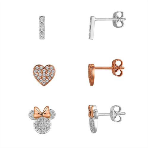 Now you can express your love for Minnie in a multitude of different ways with this earring set. Mix and match Minnie style with this set of three different pairs of stud earrings inspired by Disney's beloved fashionista. The three designs include the letter ''I'' encrusted with crystals, a rose goldtone heart stud with cubic zirconia and a sparkling silvertone Minnie icon.