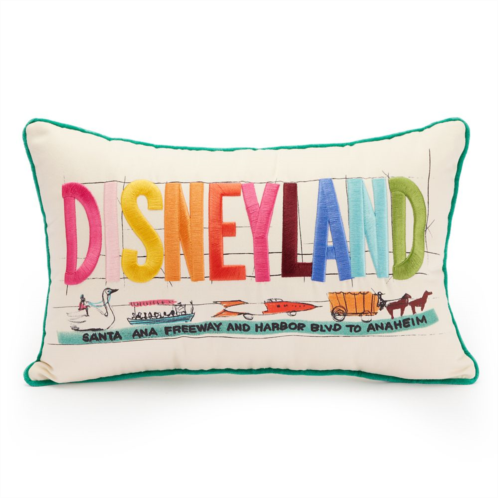 Take the ''Santa Ana Freeway and Harbor Blvd. to Anaheim'' California. There you'll find Disneyland, The Happiest Place on Earth. Memories of 70 years of Walt Disney's original Park will fill your dreams as you rest on this soft, petite throw pillow with embroidered rainbow-colored lettering on front and the timeless Disneyland Sleeping Beauty Castle logo and icon printed on back.