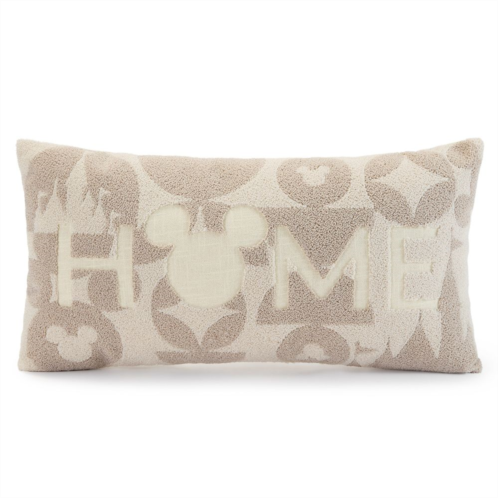 A house is not a home without the mouse. This contemporary Mickey Mouse icon ''Home'' throw pillow is a thoroughly modern accent for your decor. The textured chenille cover with ''Home'' lettering and mouse icons will prop up your back for TV viewing or provide something sweet to snuggle with when napping.