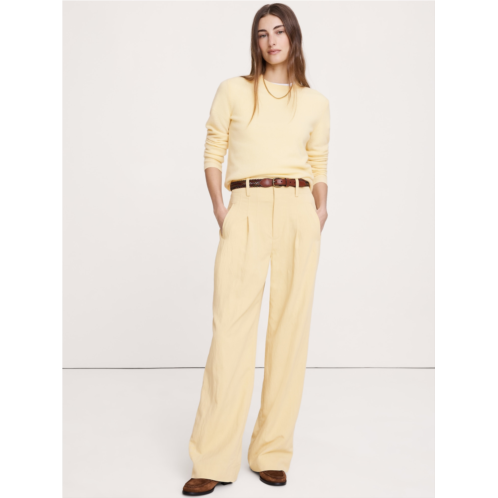 - We recreated an archival pant, preserving all the details we love about the original: the ultra-high rise, the button-tab at the back waist, and the pleated waistband construction. Here, we cut it in a drapey fabric we love for its softness and the way it emphasizes this pant's flowing, wide leg shape.