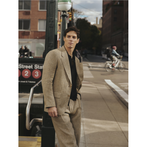 - A very cool suit, we kept the fit relaxed and easy and cut these pants in a beautiful linen fabric from Italy. Look closely: this fabric's heathered appearance is achieved by a yarn that wraps different colors of thread around each other like a strike of lightning.