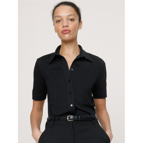 - A classic button-down silhouette made modern with our silky cotton jerseya favorite for its softness and dressed-up look.
