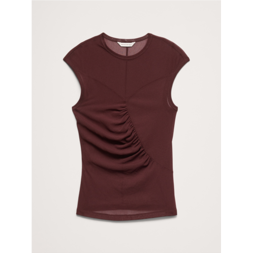 - Things we love about this cute top: the sheer mesh, the cap sleeves, and the wraparound ruched detail. Plus, it's super stretchy and t-shirt soft.Sheer