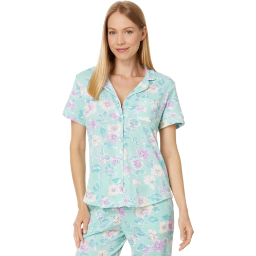 Chic comfort, reimagined: Elevate your sleep styling Karen Neuburger Short Sleeve Girlfriend Capri PJ Set. Indulge in brushed interlock fabric, satin lining for luxe comfort, adjustable elasticized waistband for perfect fit, and elegant lace detailing on collar and chest pocket. Experience the bliss of button-down closure and twill tape finish.