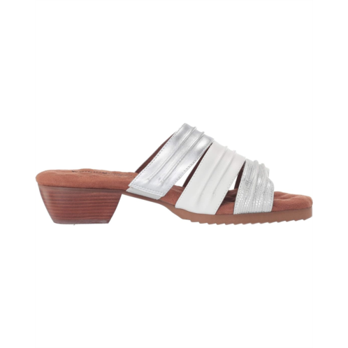 Multi leather upper in a strappy silhouette with a pleated vamp.