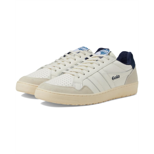 With its minimalist lines Gola Eagle shoes for men satisfy the wardrobe essential men's sneaker look for the season; a classic court. Understated panels, old-school upper perforations, and a tennis-inspired color combo play to Gola's tennis heritage. An old-school terry towelling lining and off-white cup sole give a vintage sports look. The round-toe shoes feature a leather upper, breathable leather lining, and rubber insole. The low-top silhouette with lace-up closure allows a secured fit.