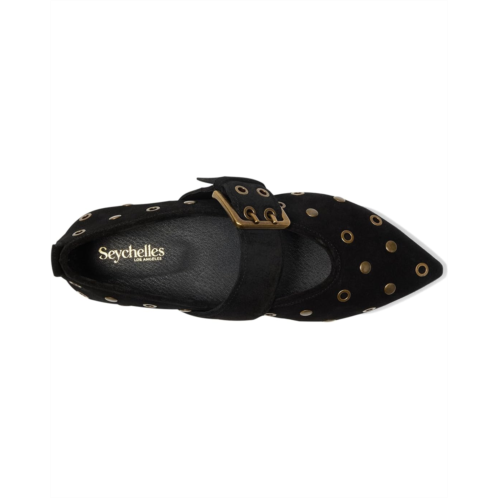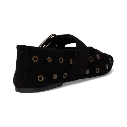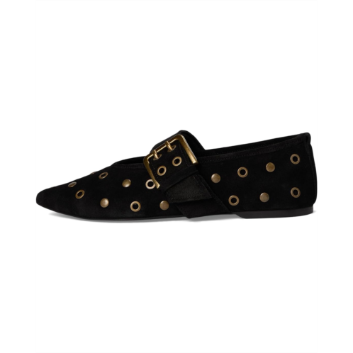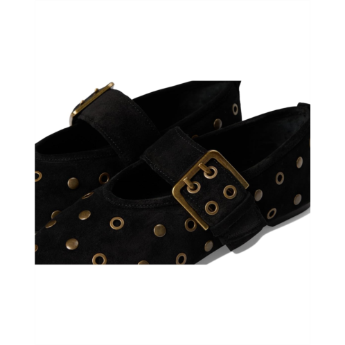The Abbey Flats by Seychelles features all-over grommet embellishments, a strap with a buckle, and a modern pointed toe. An edgy take on a Mary-Jane Ballet flat. The low-top style features a soft suede upper, faux leather lining, and a padded insole.