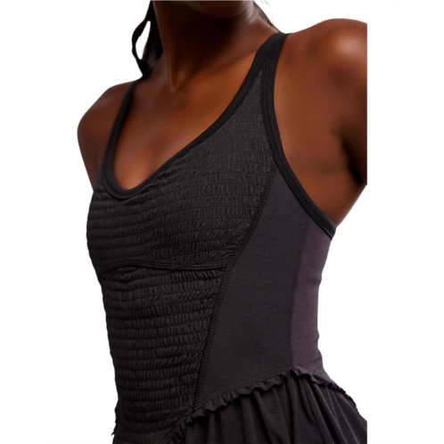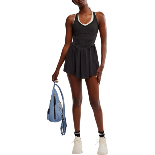 Play hard and sweat in style wearing the FP Movement Smockin Hot Dress. Crafted using sweat-wicking fabric, featuring sweetheart neckline, sleeveless style, relaxed fit, built-in shorty bodysuit (bra and shorts) for added coverage, smocked front with elasticated ruching, cross-back strap detail, built-in shorts feature phone pocket, and corsetkorea detailing.