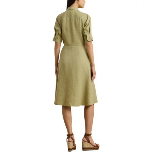 Light as air linen brings a breezy look and feel to this iteration of Lauren Ralph Lauren Petite Wakana Elbow Sleeve Day Dress, while a charming self tie waist adds to its easy character. Featuring fit and flare silhouette, point collar neckline, concealed buttoned placket, and three-quarter length sleeves.