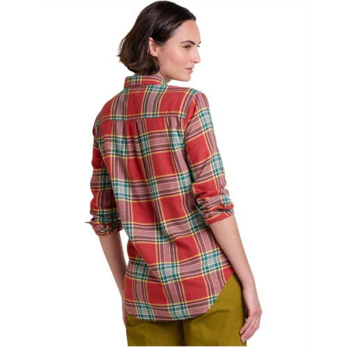 The Toad&Co Re-Form Flannel Long Sleeve Shirt for an outdoor queen. It is a lightweight herringbone weave made better by recycled polyester that is available in epic color combos. This shirt is comfortable and stylish and made from soft, lightweight herringbone twill crafted from post-consumer plastic bottles and salvaged cotton textiles. This shirt is perfect for any casual outing, featuring long sleeves with adjustable cuffs, a classic collared neckline, two button-through chest pockets with flaps, and a buttoned front closure. The droptail hem adds a modern touch to this classic design.
