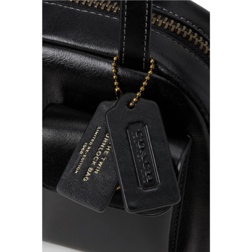 The COACH Twin Turnlock Bag 20 is a hand-carry bag with four protective feet at the base for convenient carrying. Made from waxed smooth leather, this luggage bag is designed with dual grab handles and a zippered top closure. With its two outside turnlock pockets, an interior compartment, and an inside snap pocket, this leather bag offers enough space for all your essentials.