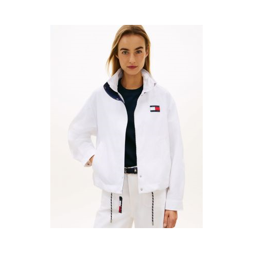 Tommy Hilfiger women's jacket. This sporty sailing jacket is made with a water-resistant, crispy nylon shell, a breathable mesh lining, and an adjustable drawcord hem. The funnel-neck collar is emblazoned with bold branding for a standout look.