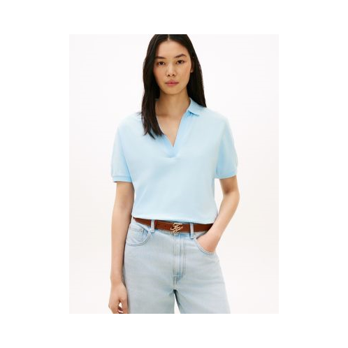 Tommy Hilfiger women's polo. Channel sporty vibes with this relaxed polo, designed in a versatile hue with an open placket. Made from premium cotton pique, the medium-weight stretch fabric offers a soft, lightweight feel that keeps you comfortable all day.
