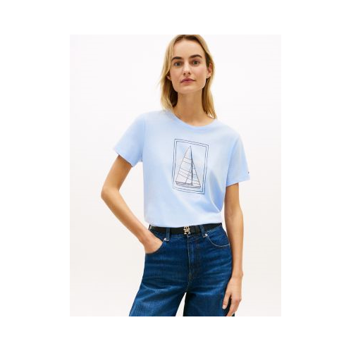 Tommy Hilfiger women's T-shirt. Made from soft, stretchy cotton jersey, our sailboat graphic tee is a comfortable layer with maritime spirit. Wear it while running errands, relaxing at home or on weekend coastal adventures.