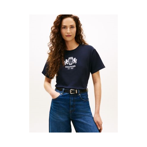 Tommy Hilfiger women's T-shirt. This tee is cut in an easy fit and designed with a preppy Hilfiger crest logo. Made from pure cotton jersey, it's a soft, comfortable layer.