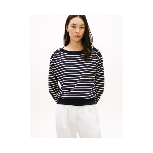 Tommy Hilfiger women's sweatshirt. This sweatshirt is made from a fine baby terry weave with a garment-washed finish for a smooth feel and exceptional softness. Gold-tone buttons at the shoulders and horizontal stripes add nautical spirit to this flattering boatneck pullover.