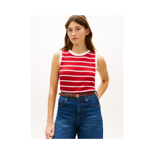 Tommy Hilfiger women's sweater. This striped sweater vest leans into its preppy roots with a textured cable knit design. Made from combed cotton, it stays soft, breathable and durable wash after wash.