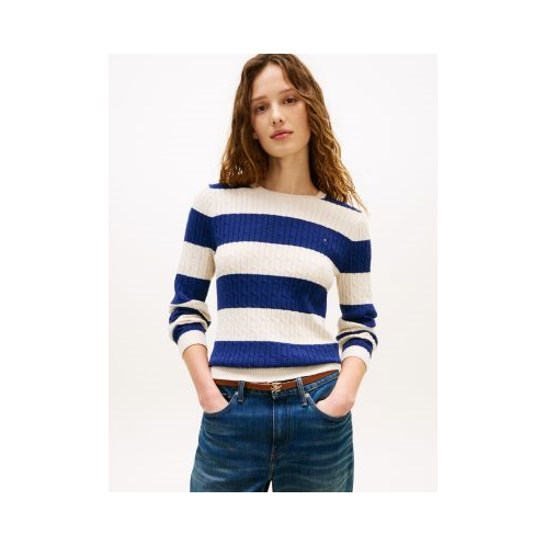 Tommy Hilfiger women's sweater. Made from premium cotton in an easy fit, our cable knit sweater is a soft, comfortable layer. This version is updated with rugby stripes for a sporty prep feel.